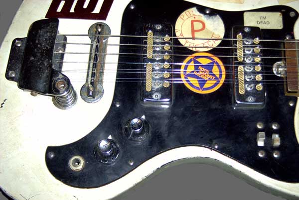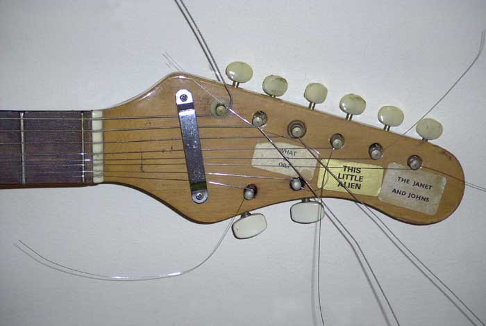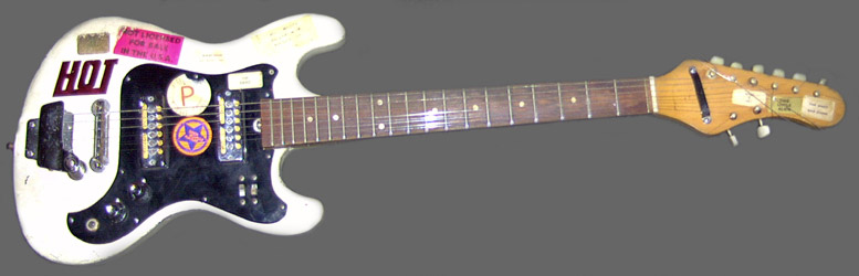 As you've probably gathered from reading Protag's excellent treatise on our other equipment, this spirit of "buy cheap gear and frig about with it" lived on with the Automatons. I was in no way as knowledgeable or as inventive as Protag, but I was inspired by Big Joe Williams and his 9-string oddity. I bought a Woolworths Top Twenty electric guitar from another junk shop, and set about customising it.