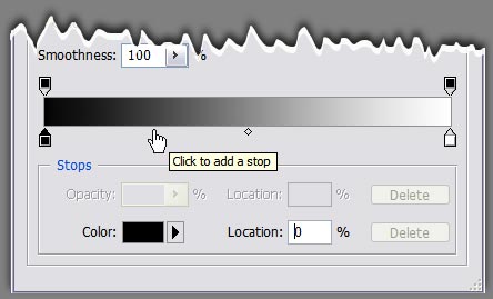 Step 2: Click on the gradient in the middle of the dialog box. This opens the Gradient Editor. If your selected gradient is like the one in the dialog box above, you will have two colour stops; a black one at location 0% and a white one at location 100%. Move your cursor to the bottom of the gradient until it turns into a pointy finger, like this: